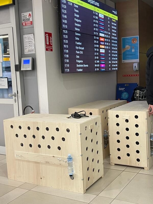 We take extra care to prepare your puppy for travel. We attach food and feeding instructions to the top of the crate, and include frozen water bottles that will gradually thaw to keep the puppy hydrated throughout the flight. The typical flight lasts 4 to 7 hours, and with proper registration, your puppy will usually arrive within 24 hours. I stay updated on any potential delays or layovers and track the exact times and departure details so I can keep you informed about your puppy’s journey.